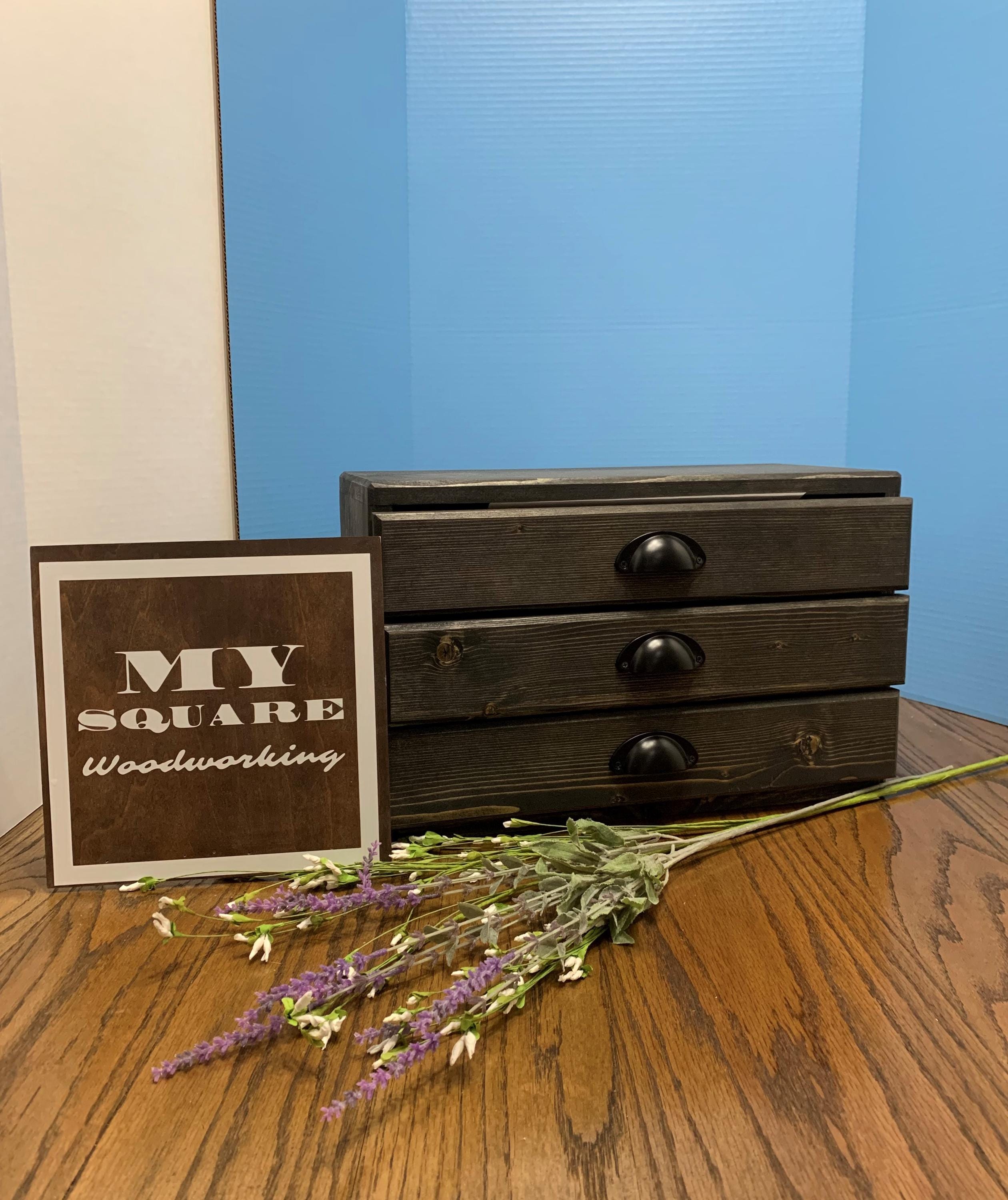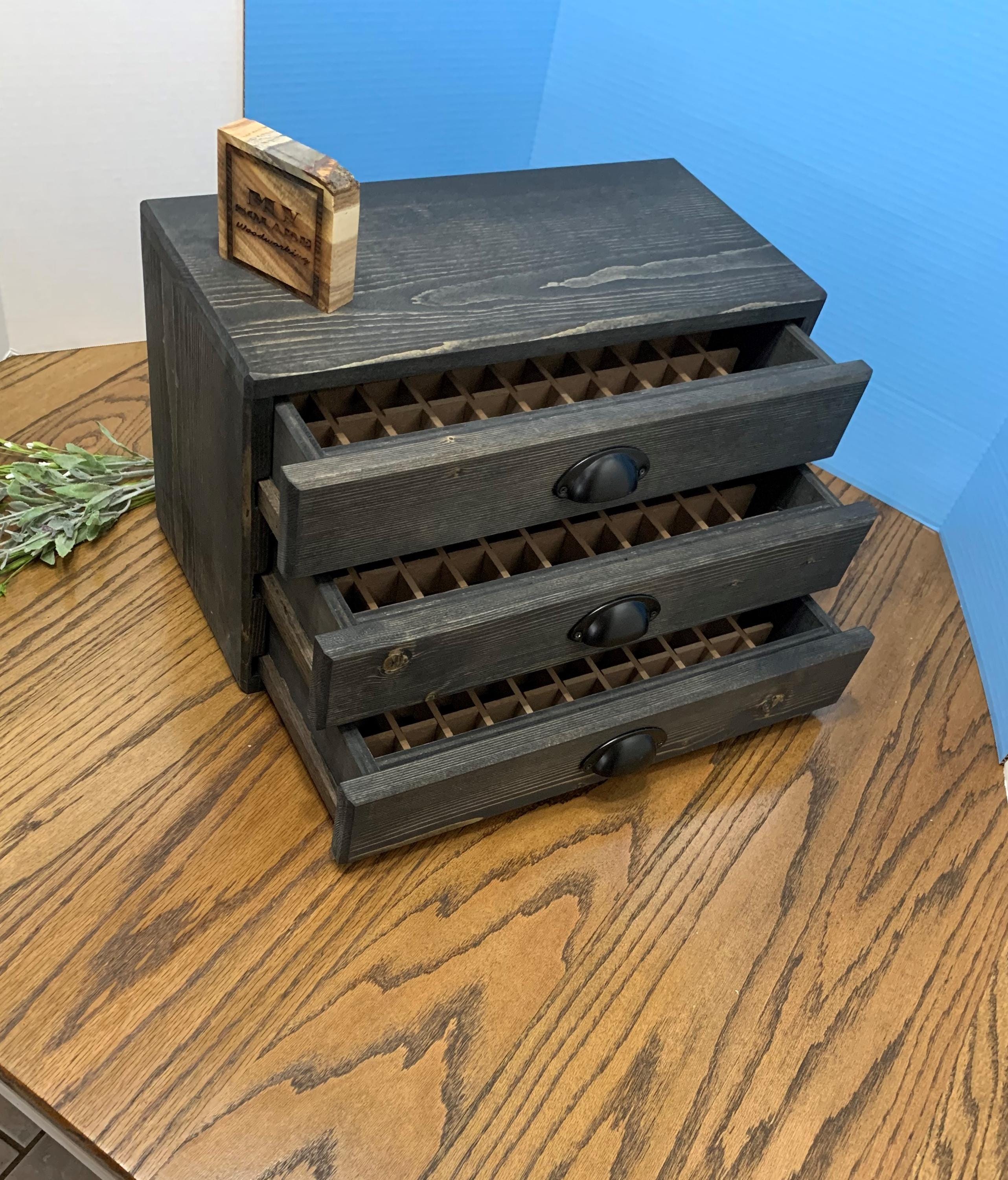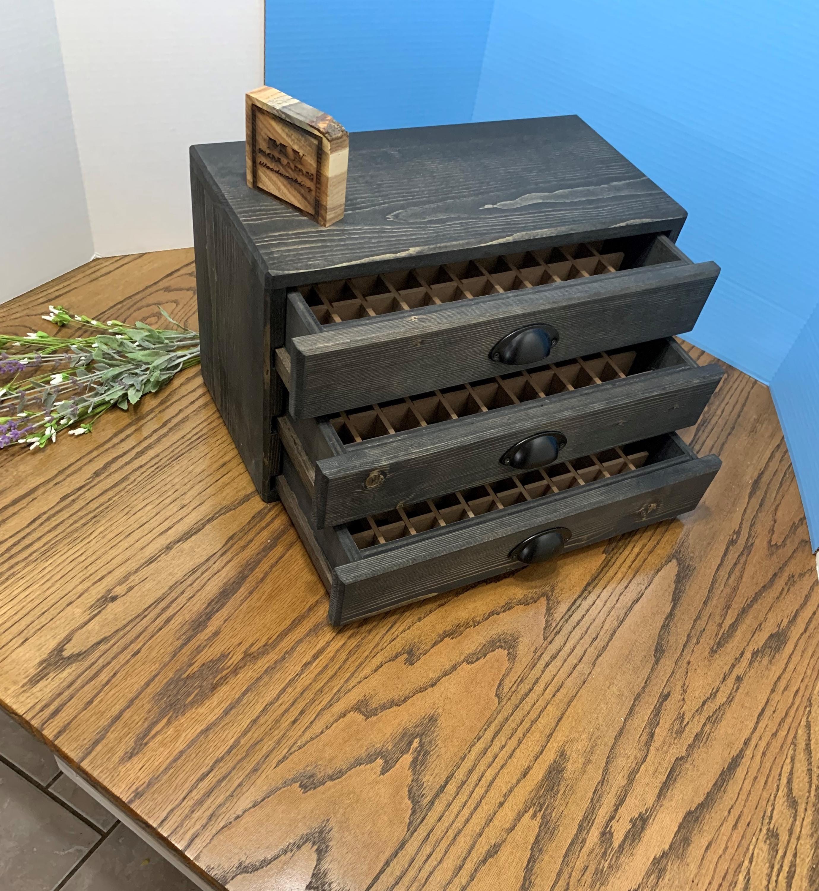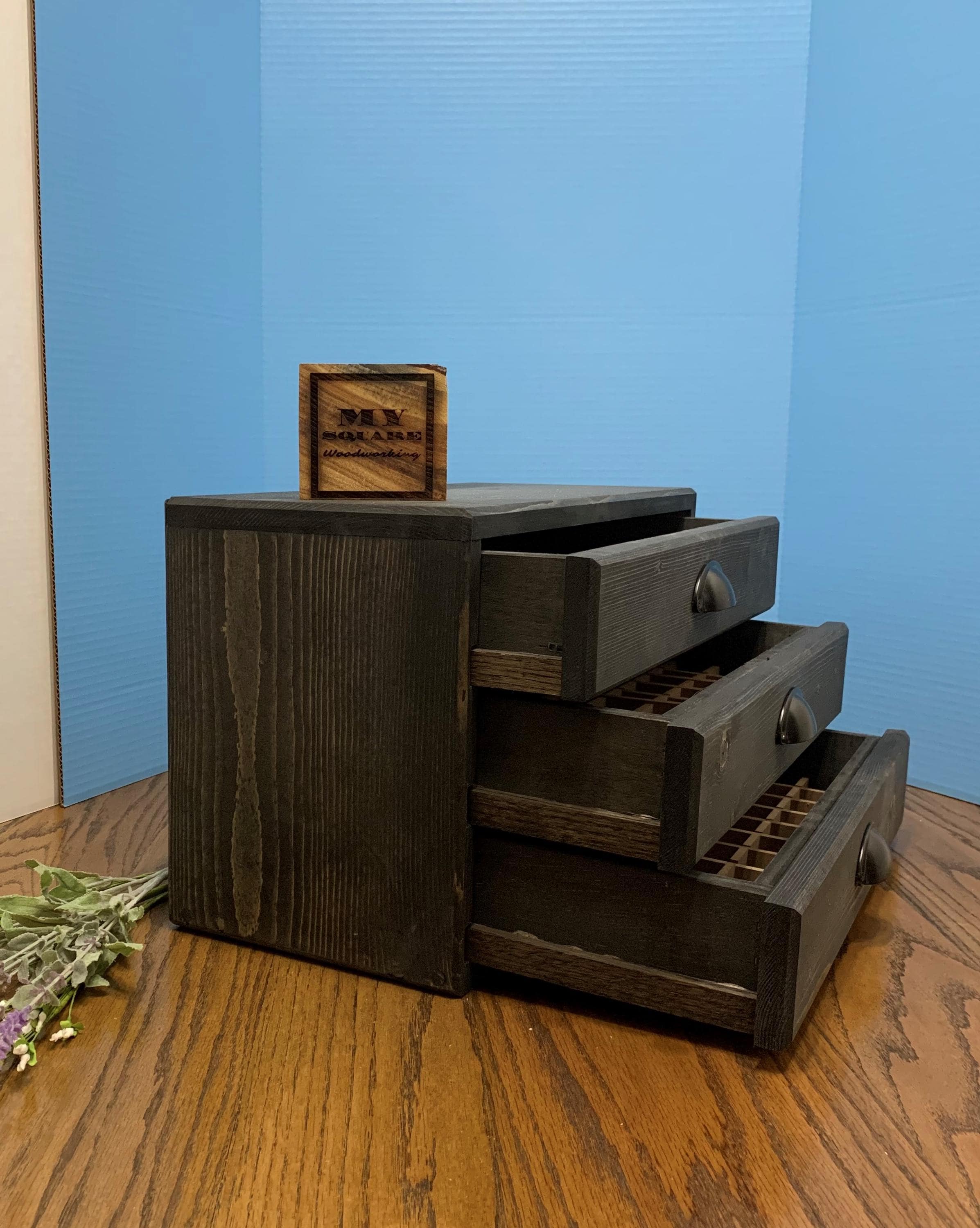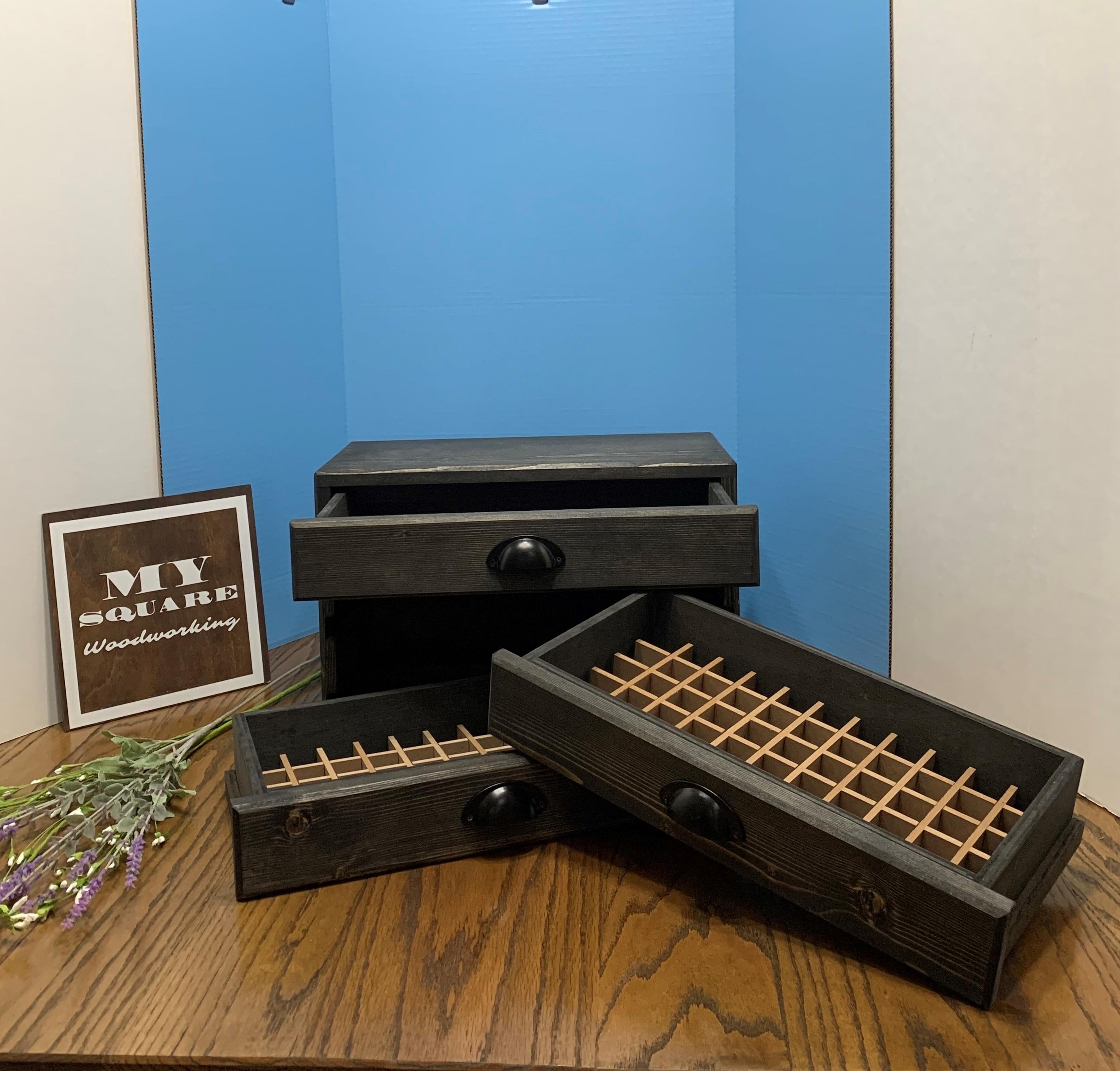 Handcrafted 3-Drawer Essential Oil Storage Chest Organize your essential oil collection in style with this beautifully crafted wooden chest. Designed to hold up to 150 bottles (5ml and 15ml sizes), it’s the perfect blend of function and rustic charm.