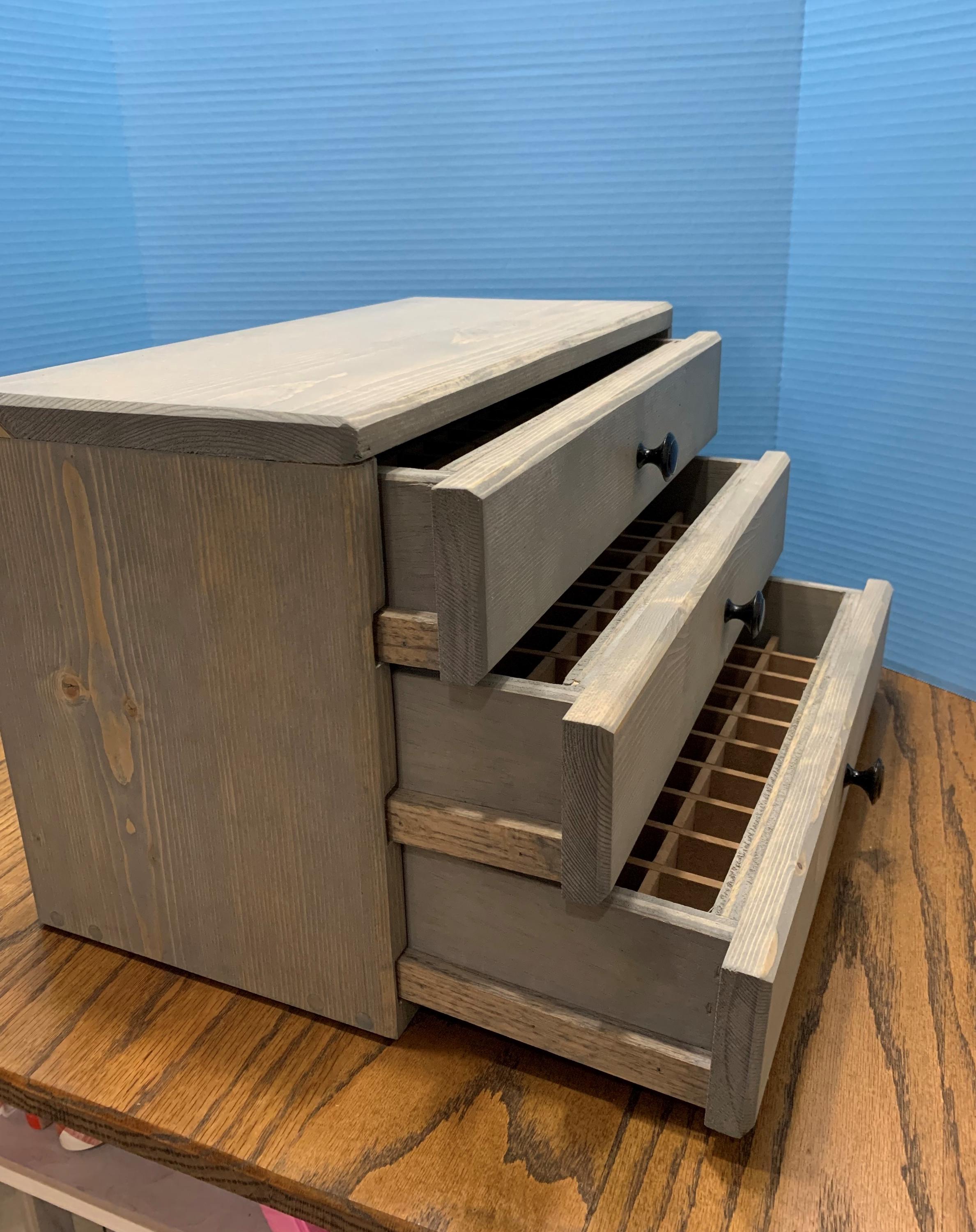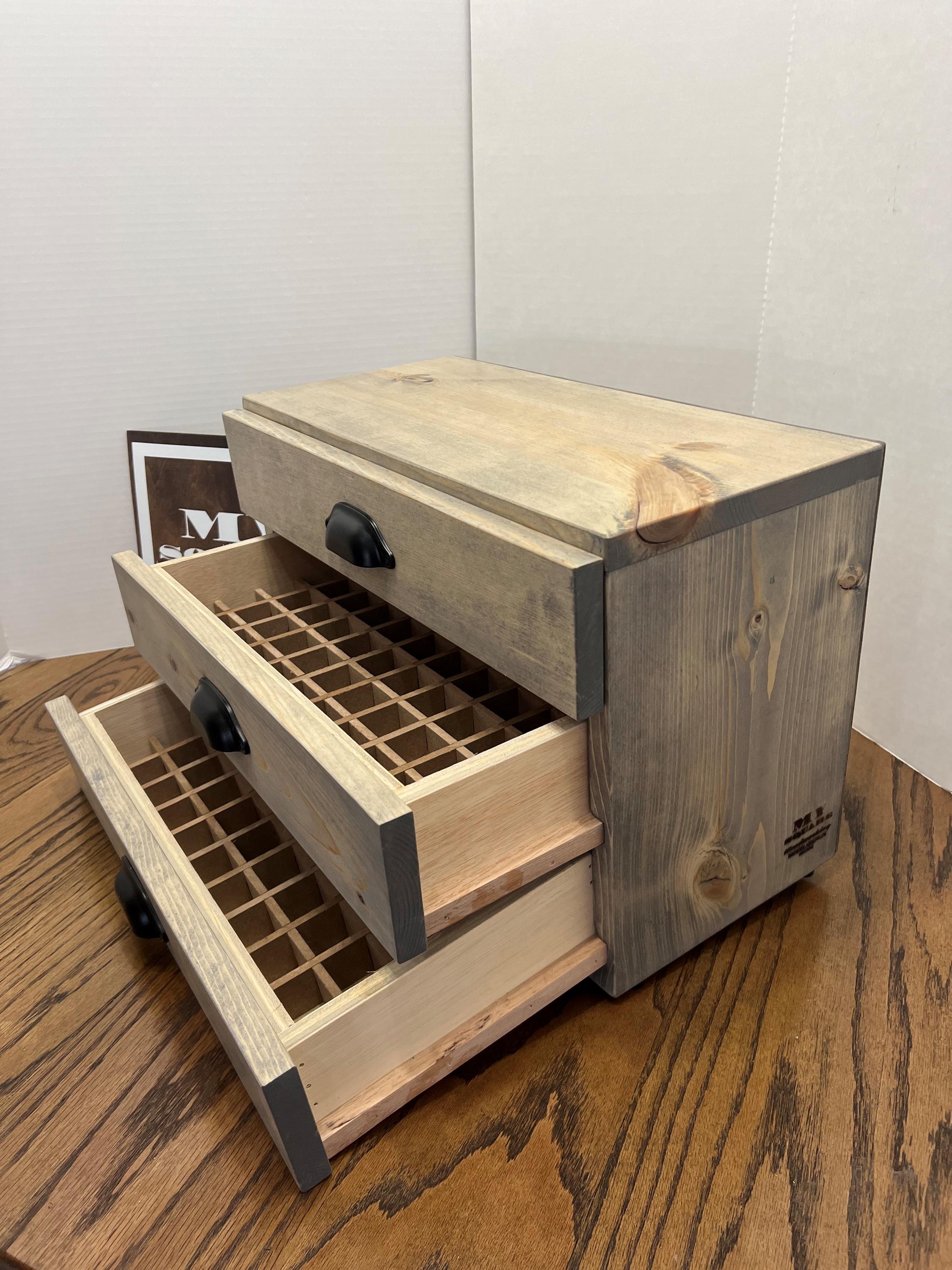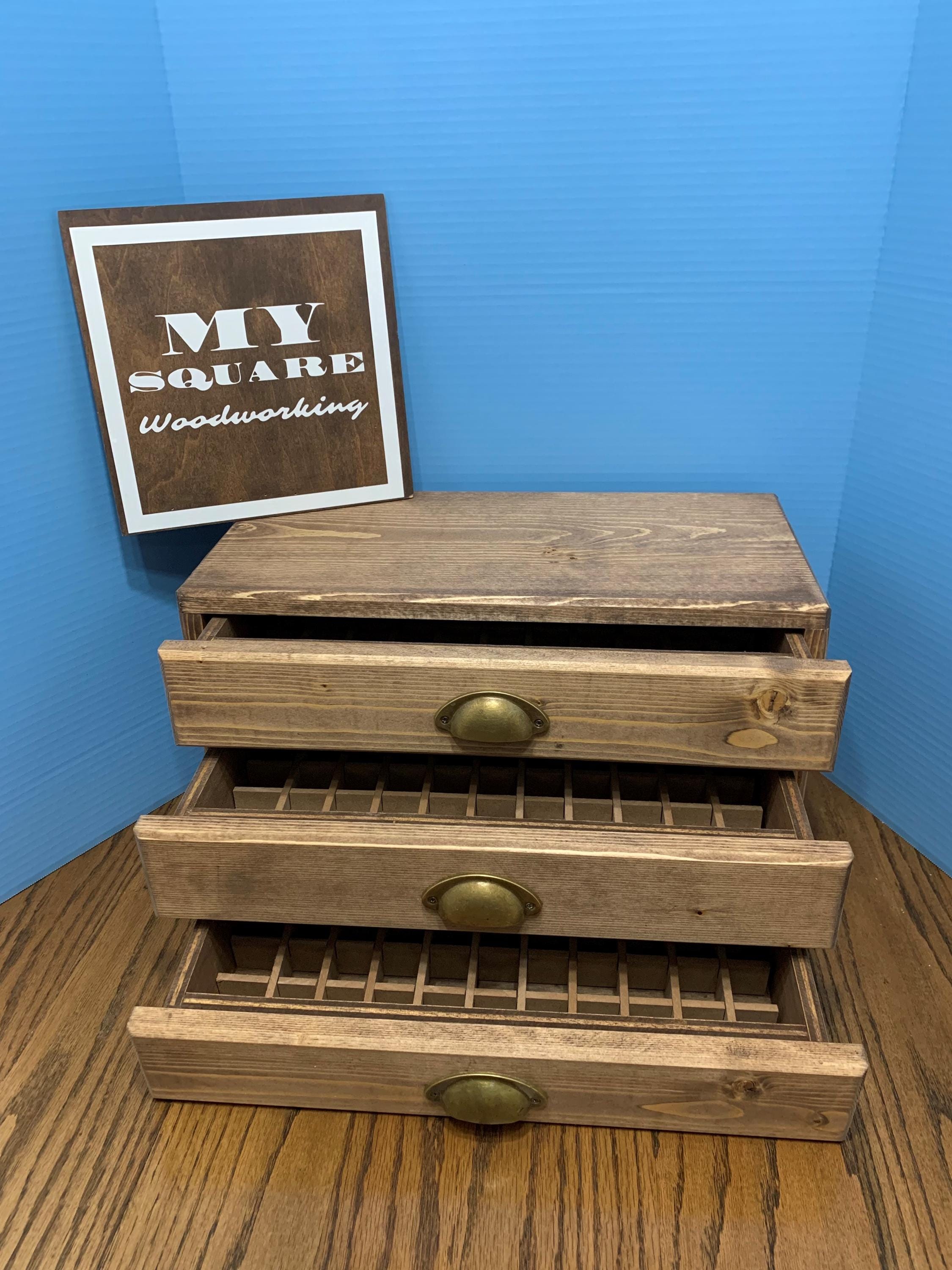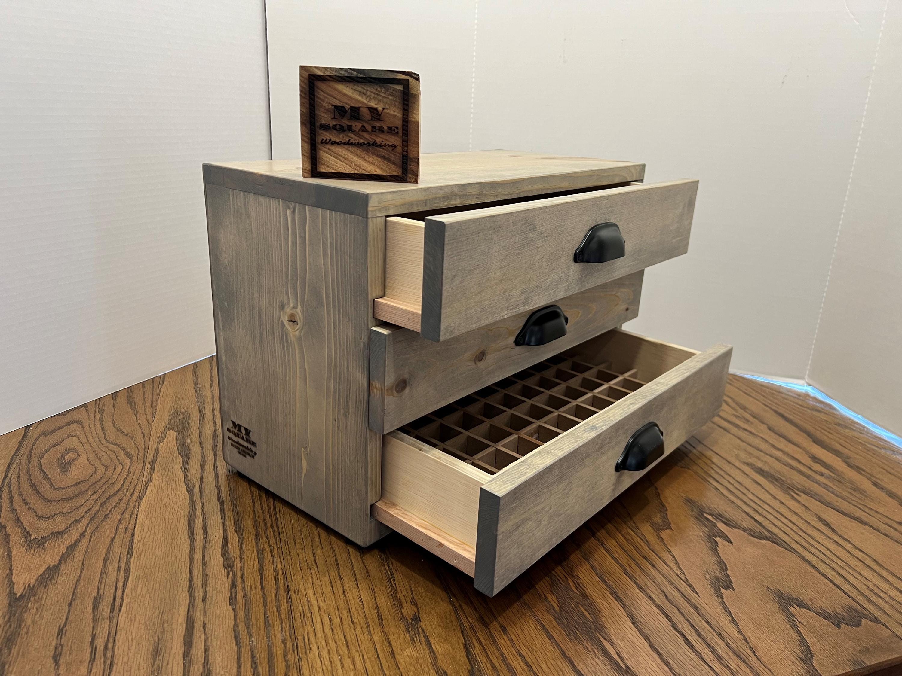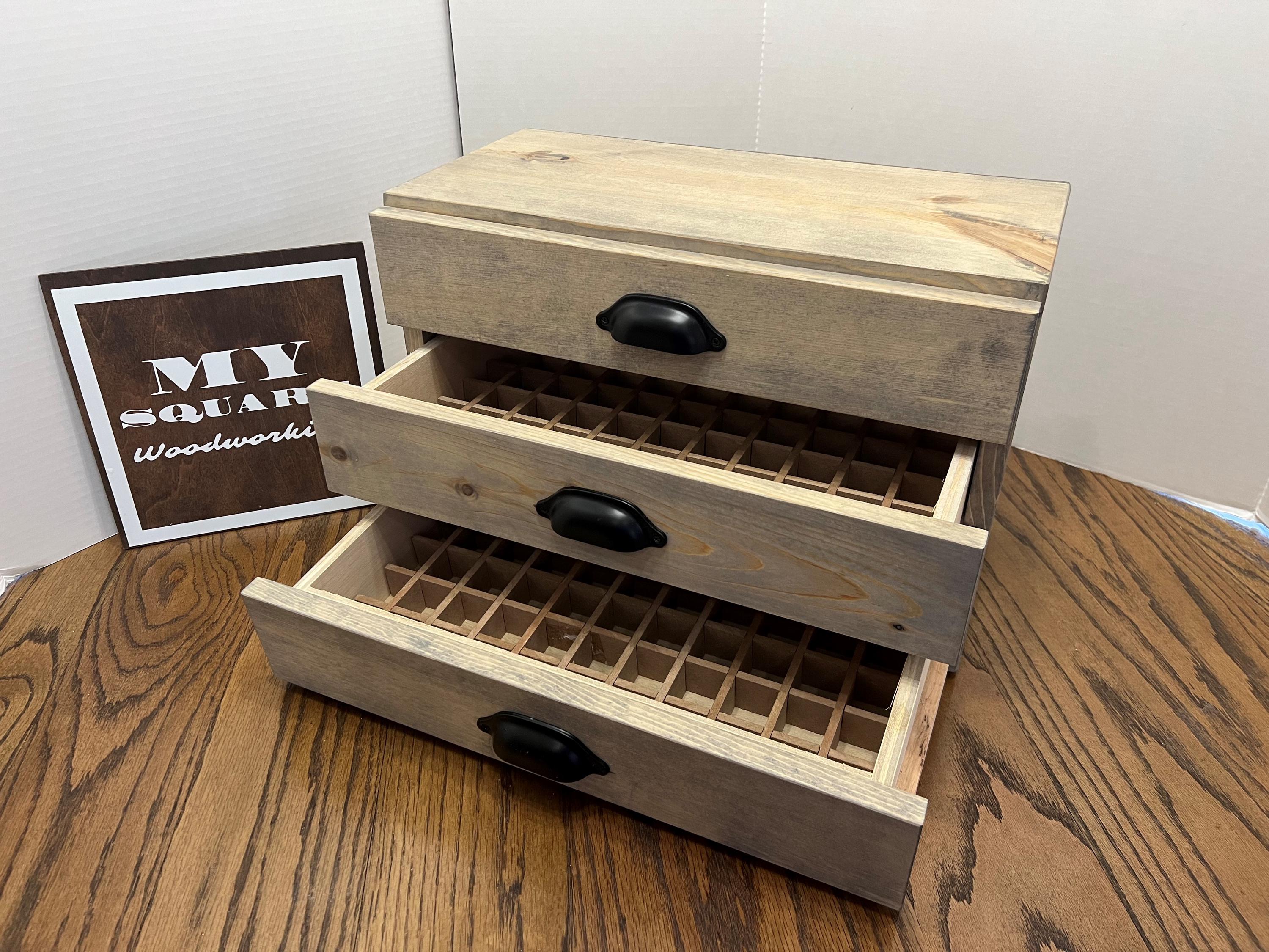 Handcrafted 3-Drawer Essential Oil Storage Chest Organize your essential oil collection in style with this beautifully crafted wooden chest. Designed to hold up to 150 bottles (5ml and 15ml sizes), it’s the perfect blend of function and rustic charm.